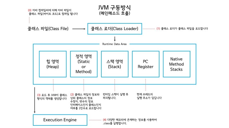 자바 컴파일러 (javac)가 자바 소스코드(.java)를 읽어들여 byte code(.class)로 변환시키고, Class Loader를 통해 class파일들이 JVM으로 로딩 된다